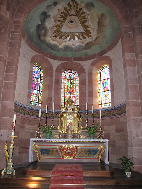 In Alsace, France, the fresco painted above the altar of the Abbey Church of Saint-Jean-Baptiste (1763) shows a large example of the eye-in-pyramid symbol, with the rays of glory breaking through the clouds.