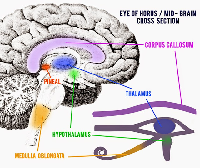 It’s as if the Eye of Horus could be a depiction of the thalamus as the eye ball with the corpus callosum the eye brow above and the medulla oblongata (brain stem) and the hypothalamus being the two markings below. If this is what they were drawing but calling it the Eye of Horus, does it suggest they considered the mid brain to be the seat of consciousness or even of divine consciousness or “Horus consciousness”? Horus being a sun god and symbolic of the universal Christ, a spiritual force which a suitably prepared person can merge with.