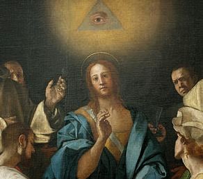 In Christianity, the all-seeing eye or “Eye of Providence” or “Eye of God” has been used as a symbol from at least the 16th century as seen in the following painting below which depicts a scene from Luke 24: 13-32 where after his resurrection, Jesus has supper with two disciples.